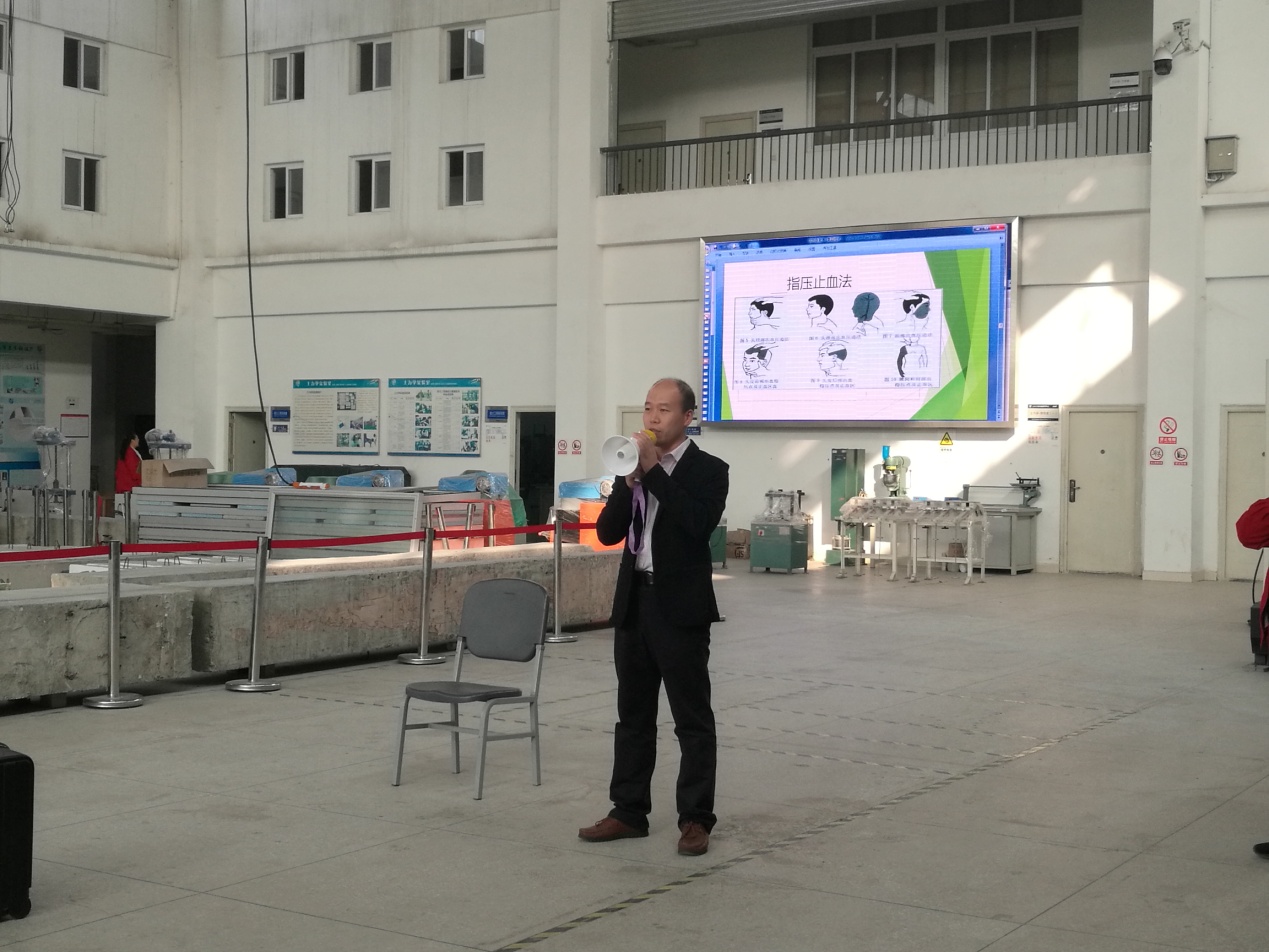 (二)对于加压包扎法与三角巾包扎法,在无专业医用材料时,可采取随身的一些干净物品进行替代,如衣服,围巾等。在使用橡皮管止血带止血时,需特别注意:此方法只能用于四肢大动脉出血时,且不可长时间扎止血带,以确保不会造成肌肉坏死这种更严重的伤害。在止血与包扎的内容讲解过程中,老师邀请现场员工一起演示操作方法,这种授课方法,使广大师生更容易地掌握了正确的包扎方法。