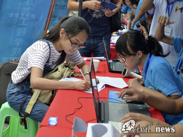 在这个喜气洋洋的日子里,新葡的京集团35222vip的迎新工作人员早早地来到位于一食堂门口的迎新点。现场硬件准备就绪后,新葡的京集团35222vip便开始今天的迎新工作。报道流程大致为,新生在出示通知书后经过简单的程序完成注册,紧接着便有党支部迎新人员或者助理辅导员带领新生领取宿舍钥匙。“学长学姐们都很热心,让我感到很温暖,希望在接下来的四年里,我能在这里愉快的学习和生活。”2015级5班新生张乐如是说到。