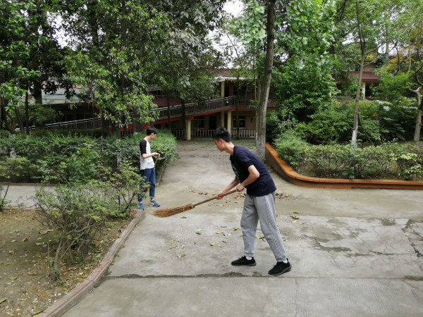在交流聊天之后,同学们按照原定计划,分为两组,一组负责清扫院内的枯枝落叶和地面的一些垃圾等;