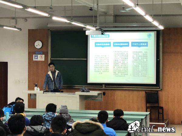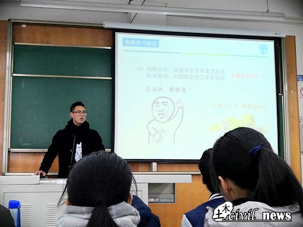 班会上辅导员老师首先从期末考试成绩的重要性出发,给予同学们一些考前复习建议,鼓励员工以寝室为单位、以班级为单位组织开展集体自习活动,班委和成绩优异的同学应当起带头作用,安排制定班级考试复习计划,积极对接联系助辅和对接寝室的党员进行答疑和咨询,同时2018级年级组给新生申请了15至17周集体晚自习的教室。为树立“以诚实守信为荣”的诚信考风意识,辅导员从多方面阐释分析了作弊对于考生在各个方面的影响,最后对《新葡的京集团35222vip本科生考试违规处理办法》逐一进行了讲解,重点说明了各类处分情况。