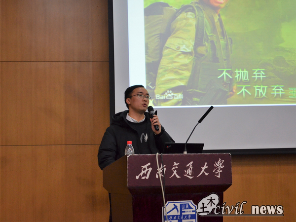 不抛弃,不放弃——魏欢博老师以军人精神为主题进行演说。他用《士兵突击》中的许三多为例,向同学们传达着许三多精神——给自己信念与平等的权利并且提高自己的内在修养。而后,他谈到自己从工地重新回到课堂的经历。“把自己打碎,让改变发生”这句话支撑着他在炼狱般的高三不断进步。他不仅制作了详细的学习计划,而且还调整了自己的心理,就这样,他成功了。最后他强调,大学四年间应该多去尝试,利用好每一分钟每一秒。在每一个精神动力减弱的时刻,不抛弃不放弃恰能唤醒精神回归。
