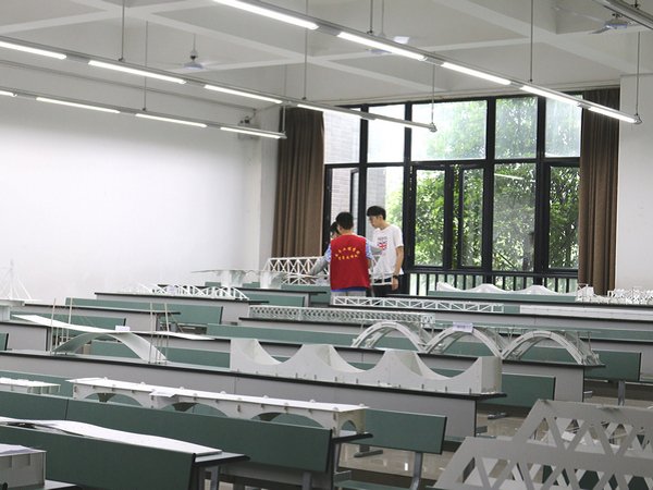 记得在交作品的那天晚上,后面突然下起了雨,而其那雨极大,应该是我在成都见过最大作品了,幸好我们组交的早,可是我舍友就不幸了,他们的顶棚被雨打湿不能再用了,尽管他们保护的十分小心了,他们的顶棚就做了一整晚,其他晚交的组也是把作品用大布罩住,几个人抬着就向四教赶过去,就像是抗洪救灾一样,虽然大家多多少少会有损失,但是都就当作一场经历,也不曾有过多的埋怨因为我们是积极乐观的“土木人”啊。之后参加决赛的小组把作品搬到图书馆接受大众和专家的评审,心情无比的紧张和欣喜,大家花长时间完成的作品有了结果,得到别人的肯定,这也是大家最期盼的事。