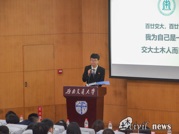 由主持人介绍了评选规则之后,第一位上场的答辩选手是新闻中心主任、土木员工会副主席顾天宇。他曾获特等奖学金、唐立新奖学金等各项奖学金六次,四川省老员工结构竞赛一等奖、美国混凝土轻舟赛赛区第六。他的答辩别出新意,将自己比作性能齐全的一台手机,激情洋溢的演说点燃了现场的氛围。