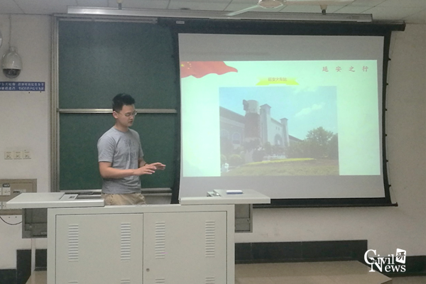 随后,党支书姚萌结合自己的延安之行生动形象地为大家介绍了发生在延安杨家岭、枣园、王家坪、南泥湾等地的革命事迹,并通过上述光荣事迹引出了延安精神的内涵,即为自力更生、艰苦奋斗的创业精神;理论联系实际、不断开拓的创新精神;全心全意为人民服务、实事求是的精神。他提到希望大家身为土木人能够通过对延安精神的学习,不断开拓进取,肯攀登,积极投入到祖国的建设事业中,为祖国建设更多伟大工程,让我们的技术引领世界。