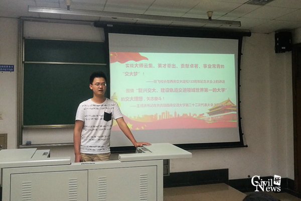 会议伊始,主持人就本次活动的主题提出了为什么要入党、为什么选择交大和隧道专业、如何把个人梦想与交大梦和中国梦相结合等问题让大家思考,随后对交大梦与中国梦的内涵进行了深入的讲解,指出我们应紧紧围绕“复兴交大、建设轨道交通领域世界第一的大学”这一交大理想,传承好交大人“竢实扬华,自强不息”的精神,并为努力实现中华民族伟大复兴的中国梦而脚踏实地,努力奋斗。