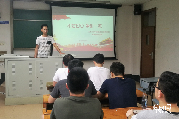 为深入贯彻落实“两学一做”学习教育,2018年6月22日晚上7点,2017级学硕隧道二班党支部在逸夫馆4421教室开展了“不忘初心,争创一流”主题党日活动。活动由党支书姚萌同志主持,全体党员和部分入党积极分子参加了此次活动。