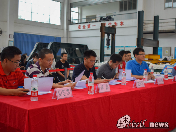 记者以参赛选手的身份真切的体验了这次充满创意的比赛。57组同学路续签到后,入席等待答辩。到场评委有:阳恩慧教授,艾长发教授,蒋鑫副教授,周正峰副教授和任东亚老师。据任东亚老师介绍,截止2015年底,我国高速公路总里程已达11.7万公里,超过美国成为世界第一。而防护栏常设计在高速公路的两侧,所以本年道路工程组赛题与去年大致相同,仍旧是设计一个高速公路防护栏。不过最大的区别在于去年是防护栏的形变越小得分越高,而且三次撞击测试撞的都是中点,而今年考虑到实际情况,改为形变量适中(1厘米)为宜,撞击位置改为三个点,分别位于1米长模型的25厘米处,中点和75厘米处。