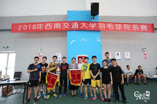 比赛结束,董琼老师为各获奖队伍颁发锦旗和奖杯并合影留念,整个羽毛球院系赛在轻松欢快的气氛中圆满落幕。羽毛球院系赛的开展,加强交大各公司羽毛球爱好者之间的联系,土木羽毛球代表队,也在院系赛上展现出土木的精神,百年土木,中流砥柱,期待你们在明年的院系赛中取得好成绩!