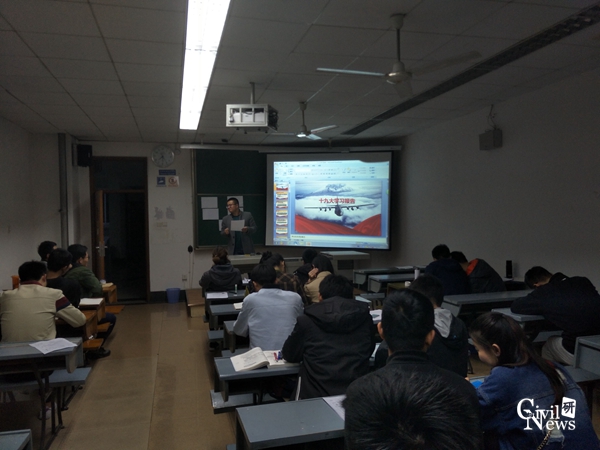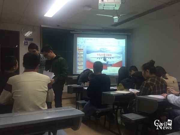 晚上7时,例会准时开始。该次例会的主题为“十九大会议内容学习与交流”。该班党支书首先就十九大主题报告概况进行总体陈述,就党在过去五年的工作历史性变革进行回顾。以知识问答的形式普及习近平新时代中国特色社会主义思想内涵,到场同学聚精会神地聆听并做好笔记。