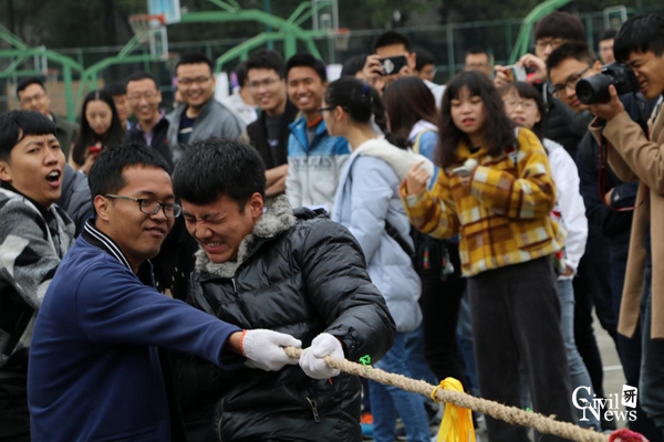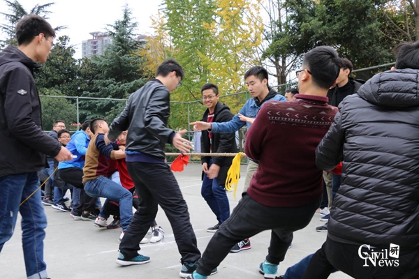 11月20日中午12点30分,2017级研究生拔河比赛正式开始。此次大赛以促进各班级间交流为宗旨,丰富员工们的课余生活为目的,用比赛的形式为员工们提供了展现各班风采的机会。通过比赛发扬了团队精神,增强了同学们之间的凝聚力。