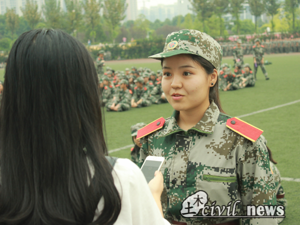 首先,九连的女生叶丽努尔接受了采访。她告诉记者今天的训练内容是——分列式训练,在本次训练中,她收获了许多:“我知道了集体的重要性,因为只要有一个人走不齐,后面都会受影响,被要求重来一遍。”当被问到女生和男生军训是否有不同时,她严肃地说:“女生和男生的训练内容是一样的,也很严格。不会因为是女孩子就对我们放低标准。”除了对集体的认识和身体素质的提高,叶丽努尔也在军训中认识了许多朋友,收获了友谊:“本来土木女生一个班很少,但这次军训认识了别班的和别的公司的女生,大家相处得很愉快。”