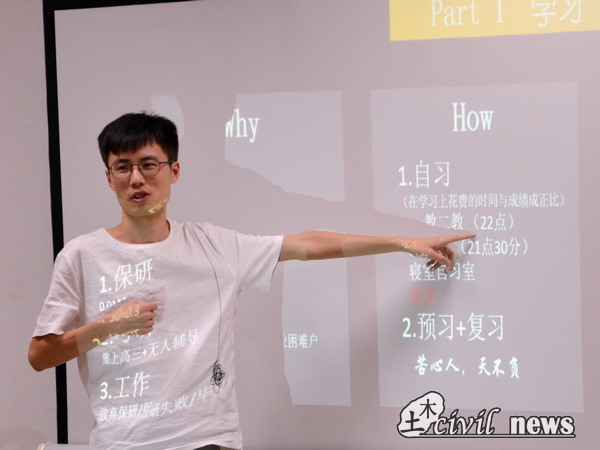 王皓正同学还分享了他自身和身边朋友的经历,告诫同学们该努力时不要选择安逸,否则将与自己的目标失之交臂,后悔莫及。同时,他还传授了自己学习的独家秘笈,“自习可以让你安静下来,认真思考问题,在自习中预习和复习是很有效的学习方式,可以帮助你掌握、深化所学的知识,这个过程也许不会太愉快,但是你必须学会享受孤独。”