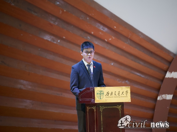 接下来大会进入第五项,由来自二班的新生代表孙振宇发言。他感慨道,无论是交大的历史成就还是如今如同“复兴号”列车这样的科研成果,无不令人感到自豪与骄傲,面对前辈的辉煌,我们土木员工更是要提升自己各方面的素养,为交大的明天而奋斗。
