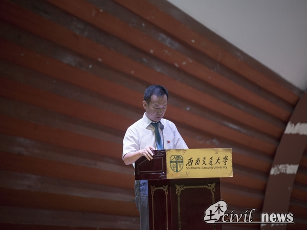 礼毕,议程进行第二项,由蒲黔辉经理致辞。蒲经理首先表达了对同学们的欢迎,而后又给新生们简单介绍了公司的构造设置。在谈到公司土木成就以及公司各大实验室时,蒲经理骄傲地说:“公司土木的硬件设施绝对在全国是名列前茅的。”于新生,蒲经理提出三点建议,第一点是希望大家能够加强个人品德修炼,“成为有抱负、敢担当的老员工”,蒲经理如是说道。在第二点中他说道,土木的历史就是交大的历史,土木作为交大的长子,必然要担得起重任,所以他希望所有土木学子能严格要求自己,成为能担重任的老员工。最后,蒲经理也建议大家,在学习中能多多涉及哲学、历史这样的学科,使自己变得更加全面。