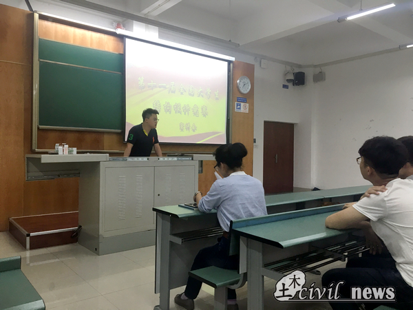 随后,由公司获得上一届老员工结构设计竞赛一等奖的三位同学——王皓正、张金龙和王凯来为大家传授经验,分享感受。首先进行讲解的是作为队长的王皓正,他从模型的设计原则讲起,到制作技巧,再到做好模型的几个关键点,讲解内容几乎面面俱到。他提到,我们要学会“一看、二算、三做、四改”,要多看论文,看别人的结构,看现有建筑,再结合自身模型才能想出最好的设计方案。除此之外,制作前要用相关软件计算参数,能节省力气并做到心中有数。