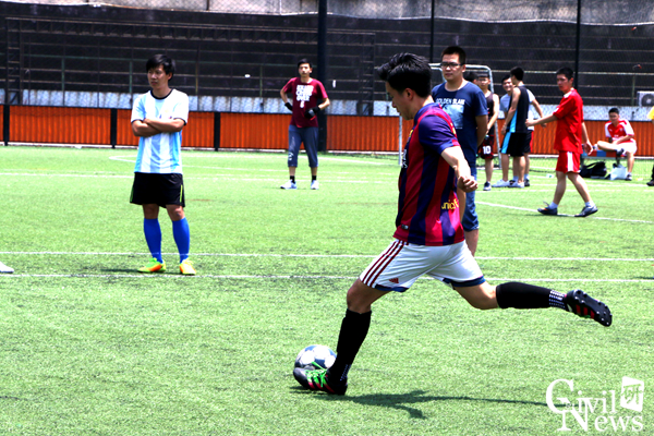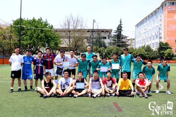接下来进行的是最具重量性的决赛,决赛在专硕结构和博士班之间举行,这注定是一场激烈的大战。随着裁判的一声哨声,球场上顿时沸腾起来。专硕结构以两胜一平小组第一出线,意志坚决,欲与博士班一决高下。专硕结构选手不断进攻,精准的传球,激烈的快攻,引得场边阵阵掌声,频频上演精彩的盘带、传射。开场后不久,专硕结构队员文鸿首发进球。但博士班毫不示弱,凭借积极地拼抢,创造了几脚很有威胁的射门,都被专硕结构门将郭强拦在球门之外。下半场,博士班重新调整了战略队形,调整心态进行反攻。场上形势越来越胶着,时时发起高潮,场边的观众也渐渐的多了起来,大家连连欢呼叫好,紧张的气氛一直环绕在球场上方。终场时,比分定格在1:0,专硕结构赢得此次比赛的冠军!专硕隧道罗川疆与博士班张川并列最佳射手,专硕结构文鸿获MVP称号。