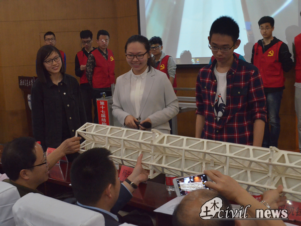 下午的比赛1点30继续举行,经过了一上午的比赛,评委老师们和工作人员依旧神采奕奕。在下午的比赛中,有很多组加载失败。其中一组的桥梁发生了严重垮塌,桥支座支离破碎,但他们表示会努力改进,来年再战。交大附中的同学们也饱含热情地来到了比赛现场参观,郑凯锋老师从结构体系和材料种类性能对员工们讲解了一些桥梁知识。评委们还与员工展开互动,让员工们亲身接触,感受桥梁的魅力。下午4点30分,全部的桥梁加载完成。