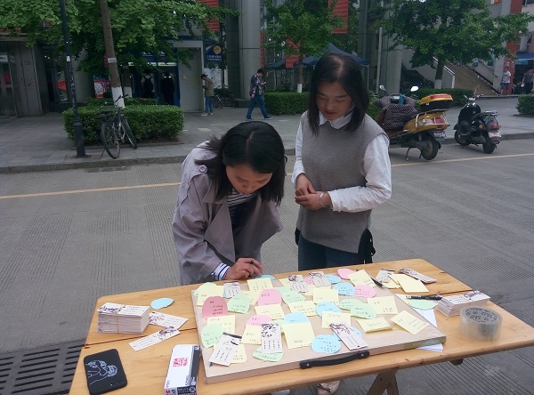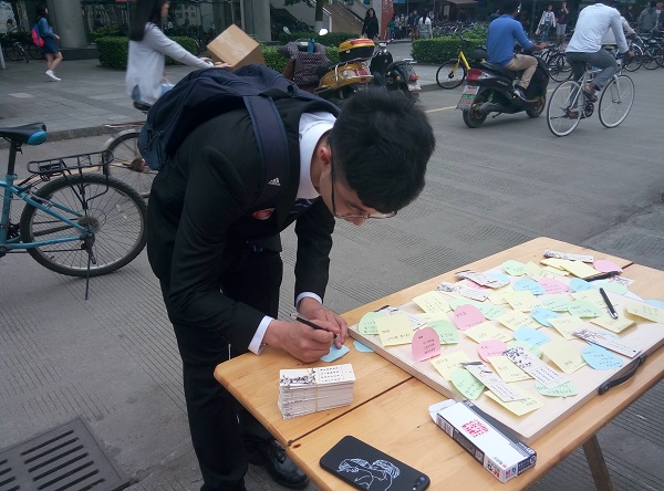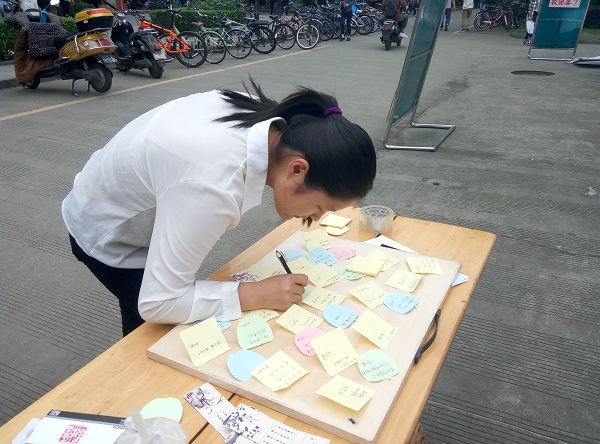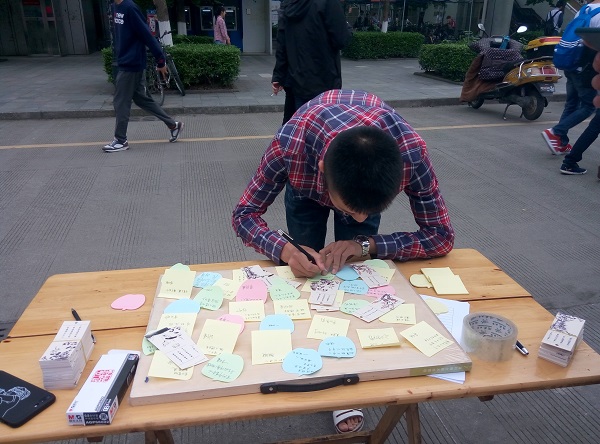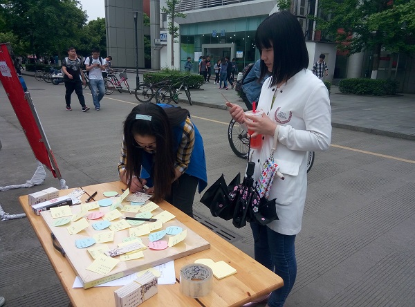 活动开始后,工作人员向路过的同学宣传活动,同学们也表现出了极大地兴趣,在便利贴上面写下了自己对廉洁的认识,并且庄重地签下了自己的名字。工作人员将同学们写好的便利贴粘贴在白板上,并且给每位参加活动的同学赠送精美书签。