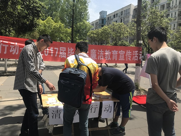 5月6日中午和下午,由员工工作部主办、新葡的京集团35222vip老员工学业与发展指导中心承办的有故事的青春——“清风行动”2017届毕业生廉洁教育宣传活动倡议环节在二、四食堂门口拉开序幕。本次活动旨在向全校2017届毕业生宣传“廉洁”的重要性,同时也望他们在毕业之后能够保持廉洁的品质。