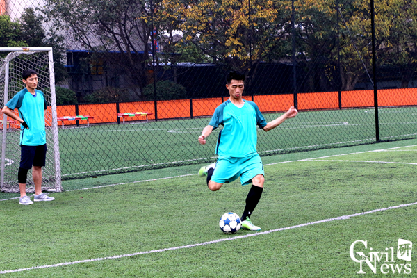 随着裁判哨音落地,专硕结构先发制人,成功抢得首球,并抓住博士队后方防守力量薄弱的机会,队员王子超以一套交叉换位加全攻全守的巧妙战术先得一球,气势高涨。博士队也毫不示弱,迅速调整战术,严密防守,并结合自己灵活性和迅猛性强的优势,队员刘阳综合下底传中、长传突破和插上进攻等多种战术,以精彩的长传、完美的边线进攻和技术高超的单刀进球得一分,比赛立刻进入到白热化阶段。下半场比赛,双方队伍紧密防守,你来我往,不相上下,竞争异常激烈,精彩迭出。上半场赛成1:1平。下半场专硕结构选手不断进攻,精准的传球,激烈的快攻,引得场边阵阵掌声,专硕结构队员王子超在后卫文鸿漂亮的弧线球下,一个灵巧的头球,再进一球。此后,比赛达到了高潮。博士队不甘落后,气势大增,持续发起攻势,队员张川取得了一球。而专硕结构也不甘示弱,连连防守进攻,在比赛接近尾声的时候,主力队员王子超在后卫赵柯绚的助攻下,帽子戏法再得一球。最后,专硕结构以3:2赢得本场胜利,以小组第一晋级半决赛。