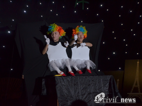 因为误会而展开的话剧《高铁换座》以幽默的剧情换来了全场观众的欢声笑语,新闻中心同学们表演的不仅是一个笑话,也是展现现实的缩影:误会不可避免,人与人之间更应该用心沟通。园区和科创的歌舞《爱的华尔兹》让土木这个男女比例7:1的公司员工们齐齐发出感叹。16级土木17、18、19班新生们表演了《海阔天空》、《友情岁月》、《真的爱你》粤语串烧;而1班同学们所演出的小人舞,以其丰富搞怪的表情和动作表演,博得了同学们的阵阵掌声。除却歌舞话剧,中国传统的相声也是必不可少的,就业和学业的《公司闲话》也为这次晚会带上了几分中国风。