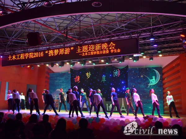 19:00既临,伴着视频的光亮,《Daddy》的音乐声,土木员工会和音乐系同学有力的动作,一支开场舞拉开了晚会的帷幕。