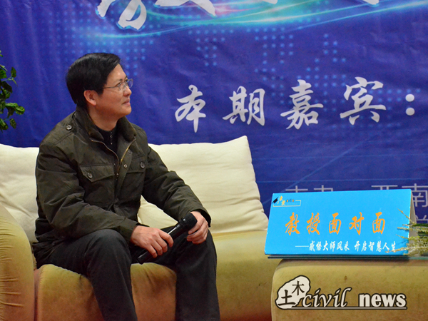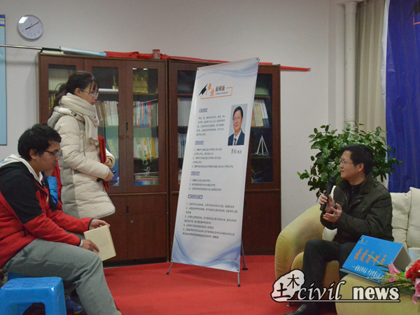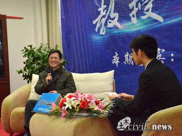 七点半,在简单介绍教授学术方面的成就后,主持人宣布活动正式开始。主持人与教授交谈的第一个问题是有关桥梁与隧道工程知识的。在场很多大一新生对这方面了解甚少,教授生动形象地举出生活中我们能够接触到的桥梁工程例子,让大家从熟悉的角度对这方面有了一定认识。这个学期,教授除了潜心于科研,还为我们大一员工兼授图学。教授目前致力于土木工程结构软件的开发与技术的研究,他讲到目前我们在图学方面所掌握的知识是远远不够的,这里面还有很大的挖掘空间,需要同学们去探索发现。