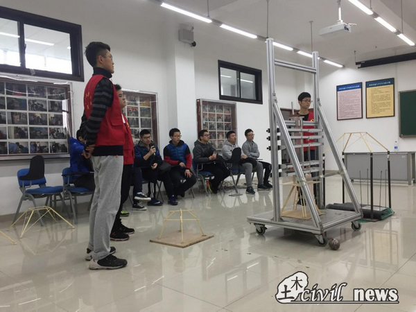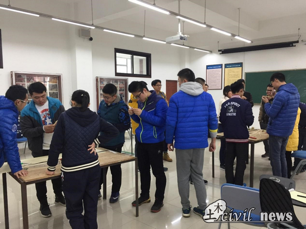 为了最大程度的给予同学们视听觉上的真实感受,交大学长们对事先制作好的模型进行了现场加载试验。在一次次饱含期待,屏气凝神中,所有的模型都结束了最后的加载。结果有失败,也有成功。失败的认真分析原因,积极做出改进。成功的,再接再厉,争取有更高的提升。结构设计大赛正是这样,在不断的尝试,努力,失败,改进中取得一个又一个的辉煌。