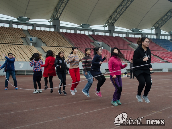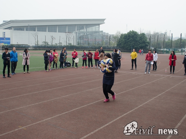 新葡的京集团35222vip共有七名女老师参加比赛,首先参加的比赛是集体跳绳。两人摇绳,七名老师同时起跳,为了增加默契度,她们每喊一个口号便步伐一致的往上跳。抛开平日里沉重的工作和繁琐的家务,她们在属于自己节日的这天尽情挥洒汗水,活力十足。土木代表队在集体跳绳这个项目中收获了一分钟跳46个的好成绩,位列第三。第二个比赛项目是两人三足,两位老师并排站立,用绳子同时绑住一人左腿和一人右腿的脚踝处,两人同时行走,来回接力。在这个比赛中,有老师不慎绊倒,但是没有放弃并依旧坚持到达了终点。老师们认真投入,在两人三足上也取得了不错的成绩。最后一个参加的比赛是运球接力跑,同样是接力比赛,在距离二十米处手抱四个排球交给对面队友,用时最短即为获胜。对于女老师来说,同时抱起四个排球并不是一件容易的事,但是她们拧成一股劲,都表现出了顽强的运动精神。一来一回的奔跑,尽管并不容易,但每一步都很有活力和冲劲。