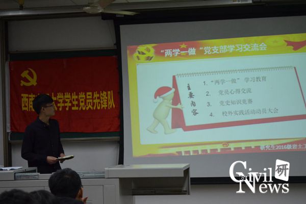 2016年11月3日下午, 2016级岩土一班在逸夫楼4320开展了“两学一做,争做模范先锋”主题的党支部特色活动,全班所有党员和入党积极分子参加活动。