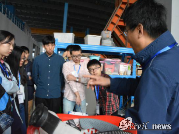 5日上午,各位成员参观了紫金港校区土木工程实验室。在一个长约150米,宽30米的巨大实验场地中,各种实验器材悉数呈现:ZD-1风洞、超重力离心机等等。各高校代表在场地中自由探讨,并就实验器材的相关问题与老师交换意见。