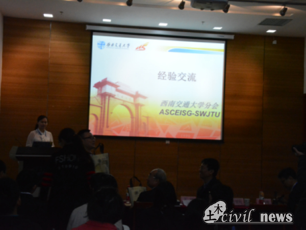 随后,同济大学、重庆大学、河海大学分别就各自公司的ASCEISG组织结构进行了介绍。公司ASCEISG-SWJTU主席韩嘉怡同学也对公司ASCEISG成立以来的各项活动——SRTP讲座、北川地震遗址考察、ASCE竞赛宣讲及选拔等做了详尽的汇报,其中她在汇报中所提及的“工程师的情怀”获得了与会嘉宾的一致好评。