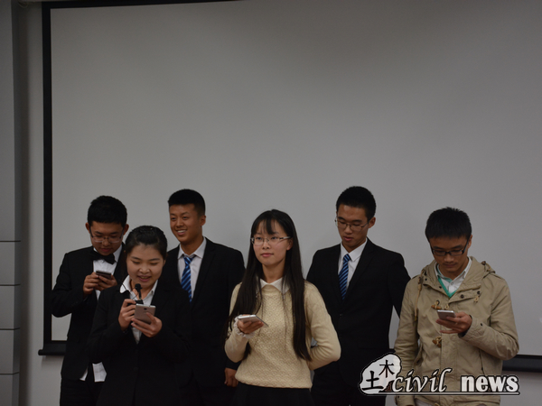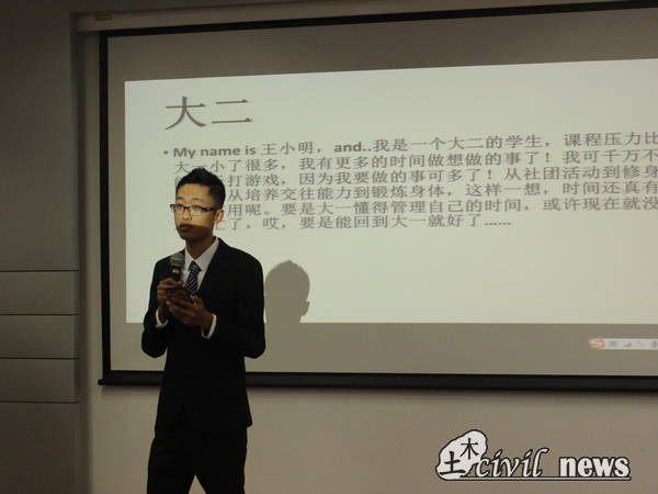 全体师生皆着正装,围坐桌旁,李书记颇为风趣地说:“这就是我们土木工程师未来的会议室。”引起一阵哄笑。在这轻快的氛围中,五个大组的同学开始轮流展示他们的作业。同学们或是描述“毕业时自己的自画像”,或是展示自己的学习生活原则,甚至还有对专业学习规划的解读。屏幕上有着精彩PPT的放映,台上有着或激昂、或煽情的讲解,台下还有着见解深刻的点评。并且,李书记也时不时发表一下自己的看法。