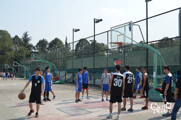 今天是比赛首日,难得阳光明媚,一共举行了6场比赛,比赛分为两个时间段:12:15-13:00, 13:05-13:50。大家都比较投入,积极度都比较高,比赛前10分钟,所有的参赛的队员都提前到达篮球场并去签到台签到。之后他们在各自的篮球场进行热身。