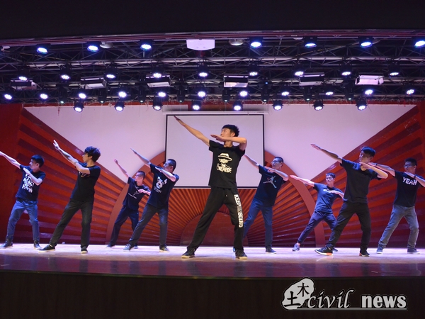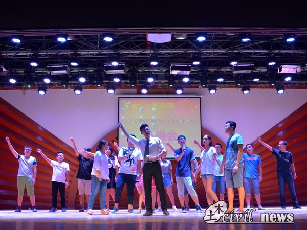 温情过去,是激情。“土木新闻中心,因你而温暖”的口号在场内一遍遍响起。他们精心拍摄的视频讲述了各个部门的工作以及部门之间无法隔断的家庭爱。新闻中心的宣讲人简单地进行了整体介绍,接下来便是有关中心日常工作的表演和与之配合的解说。在宣讲的最后,新闻中心全员来到舞台中央,再次高呼口号,对着听众深深鞠躬。作为压轴的他们,也是同样的精彩。