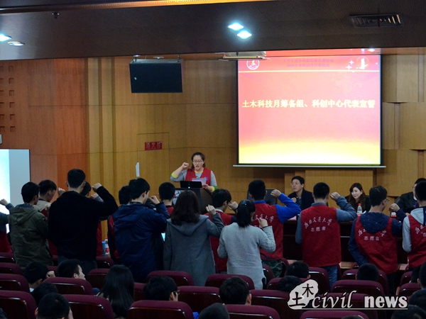 2016年土木科技月筹备组组织委员会和工作人员进行了宣誓,誓词铿锵有力,喊出了交大土木科创中心的责任与担当。誓词的余音还未完全散去,带着这份激情,开始进入本次大会的第二阶段,对新葡的京集团35222vip第十六届结构设计竞赛的命题介绍。