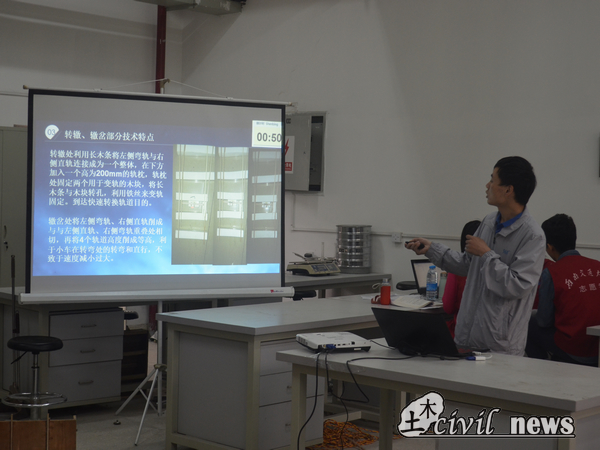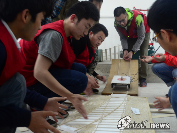 为更好的了解本次比赛的流程,记者有幸跟随E009组成员观看比赛的整个过程。首先,每个小组需派一名代表去模型放置室签字并领取模型,接着由工作人员带领小组成员去后场进行模型装载,在这个过程中,每个小组有5分钟的时间进行沙子装填,而这个过程也是决定后面的加载能否顺利进行的关键。这个过程不仅需要小组成员的齐心协力,同时,还要求每个组员在装填时要小心谨慎、全神贯注,容不得有丝毫的差错。结束了装载过程,接着便是至关重要的加载过程。这个过程包含了答辩和加载试验两个项目,也是最重要的评分标准。其中,最为吸引人眼球的便是加载试验这个项目,很多小组的模型在前两个的试验中都能比较顺利地通过并取得较高的得分,但是一旦进入弯股顺向和逆向这两个试验项目时常常会因模型设计不合理而脱轨。E009组的模型顺利通过了弯股顺向试验项目并取得不错的成绩,但是他们在弯股逆向试验项目中却因模型在试验过程中变形过大而止步。