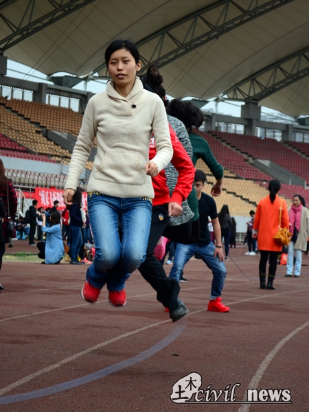 紧张激烈的正赛开始。男老师们摇绳摇的十分卖力,并且弯下腰去尽量让每个队员都进入绳子,队员们则咬紧牙关,微微皱眉,十分整齐地跃起跃下,在第一次机会中跳出了13下。短暂修整之后,老师们相互鼓励,拧成一股劲,开始了第二次跳绳。非常可惜的是,这一次出师不利,第一次跃起就直接绊住了。老师们相顾一笑,互相鼓励,笑着说:“没事,反正我们已经有名次了!”
