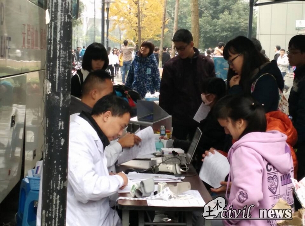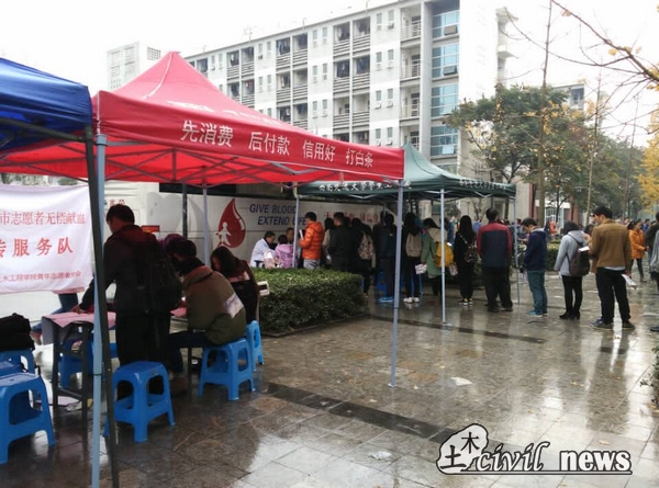 在活动当天的献血现场,经过校团委、保卫处的批准,无偿献血志愿服务宣传队的成员协助成都市血液中心的工作人员对献血的同学进行了一系列检查工作。前来报名的同学很多,不仅有我们的员工,食堂师傅也参与到了我们的献血队伍。12月3日当天活动更是出现了一个意外的惊喜,感动中国人物郭明义来到了我们南区的活动现场支持我们的活动。他们表现出了自己的人道主义风范,促进了社会主义物质文明和精神文明建设。更表现了当代老员工的爱心风采和团结奋斗的力量。他们还不时地向血液中心工作人员询问关于献血的有关规则和献血小知识。这种崇高的爱心品质值得每一个年青人发扬。刚过半个小时,献血的同学已经排成了长长的队伍,这时还有陆陆续续的同学期盼参与到这次活动中来。