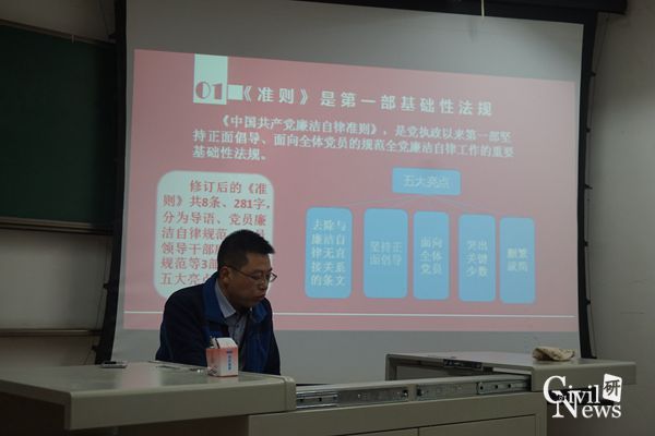 活动开始,首先由党支部书记杨绍林同志给大家全方面地介绍了新的《中国共产党廉洁自律准则》和《中国共产党纪律处分条例》。他从以下几个方面进行讲解:1、廉洁自律准则的传统文化解读;2、纪律处分条例修订的亮点;3、最严党纪严在哪儿;4、那些被误读的事儿。可以说,此次《准则》与《条例》修订目标明确、定位精准、逻辑清晰、为执纪监督提供了新的依据,凸显了中国共产党在从严治党方面的政治智慧。