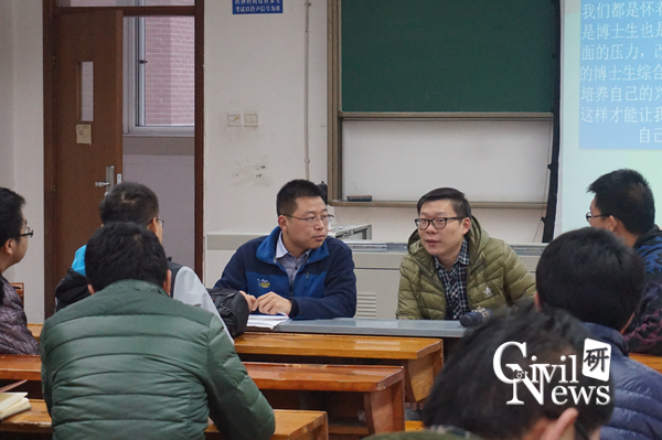 接下来,梅大鹏对博士生活、学习的情况进行了讨论。博士生活有时候是枯燥的,这个时候需要我们调节自己的心理和情绪,要做到与其他博士生之间多交流,互相学习进步。各专业之间的交叉交流也是非常重要的。并且,梅大鹏还提到,同窗友谊是非常重要的。博士生在苦心科研的同时,要多结交朋友,相互认识,相互了解,大力科研创新。多能并举,争做一名合格的共产党员,并向优秀的共产党员学习。
