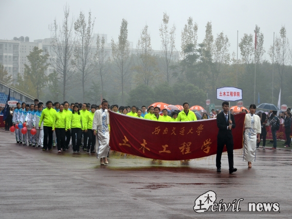 天空中虽然下起了小雨,温度也较前几天低,但是仍然无法阻挡师生参加运动会的热情。待领导进场后,国旗班的同学举着国旗踏着整齐的步伐走过主席台,展示了交大学子蓬勃向上的激情与活力。