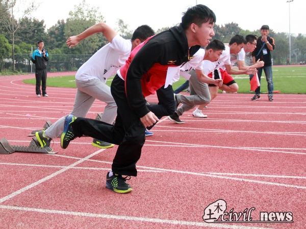 比赛就要开始,做伸展运动、压腿、活动踝关节,各位选手都在用自己的方式全力迎接即将到来的比赛。在完成了热身运动后,做好预备姿势,激动人心的百米冲刺即将开始。“跑”——随着裁判员的一声令下,所有运动员都飞奔而出。大家都知道,百米冲刺,分秒必争。欢呼与加油声如同轰雷,眼光始终紧随着运动员的身影,从起点到终点,直至百米,随着第一名的减速,第一组的比赛结束了。但是,激情依旧,热血依旧,其他的比赛竞相拉开战幕,让我们一同期待接下来精彩的比赛。