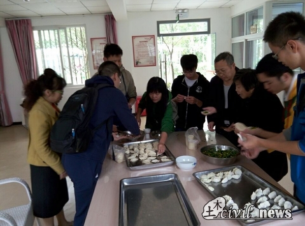 上午八点过,志愿者们就准时来到校门口集合,带着给老人们准备的水果和小礼物前往敬老院。达到目的地后,大家分工合作:有的给老人送水果和礼物,有的开始包饺子,有的陪老人聊天,剩下的部分志愿者还协助护理人员为行动不便的老人洗澡。