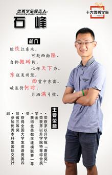 石峰,江苏南通人,来自2011级土木茅以升(1)班,土木工程地下专业与金融学专业双学位在读。现任茅以升公司员工理事会理事,曾任唐臣人·新传媒新闻网络工作室副主席,演讲与口才协会副主任。 座右铭:人如果没有梦想,那跟咸鱼有什么区别。