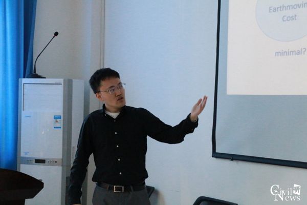 报告的第一阶段,易超绝博士简要介绍了他目前主要研究的两个方向:(1)建模和模拟施工作业;(2)开发项目规划、控制和可视化领域的创新方法和技术。随后,从实际工程案例出发,介绍了临时运输道路布局设计的优化方法,该方法以降低土方总成本为目标,在一系列相关问题基础上,有针对性地建立了与切割平面方法集成的混合整数线性规划模型,并开发了相关的仿真模型在优化土方资源整合过程中的作用,该方法可以充分确保所制定解决方案的实际可行性。报告的第二阶段,易博士代表其所在的课题组为与会员工介绍了如何申请加拿大阿尔伯塔大学工程建造与管理方向博士研究生资格以及全额奖学金要求等。