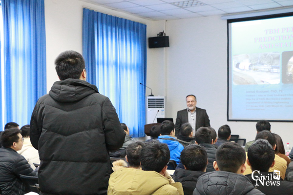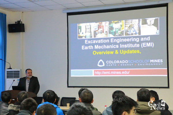 讲座主要分为两个部分。Jamal Rostami教授首先对美国科罗拉多矿业公司掘进工程与地球力学研究所进行了介绍。其中包括研究所的历史以及研究所内的各种先进的试验设备,同时Jamal Rostami教授还对各种试验设备的使用方法进行了详细的说明,使在场的同学收获颇丰。之后Jamal Rostami教授以前面所述为基础,主要讲解了“TBM刀具的设计研究”。在此过程中Jamal Rostami教授结合众多试验实例生动具体的为我们讲解TBM刀具设计的研究过程,并且为我们讲解了TBM在掘进过程的受力特点。