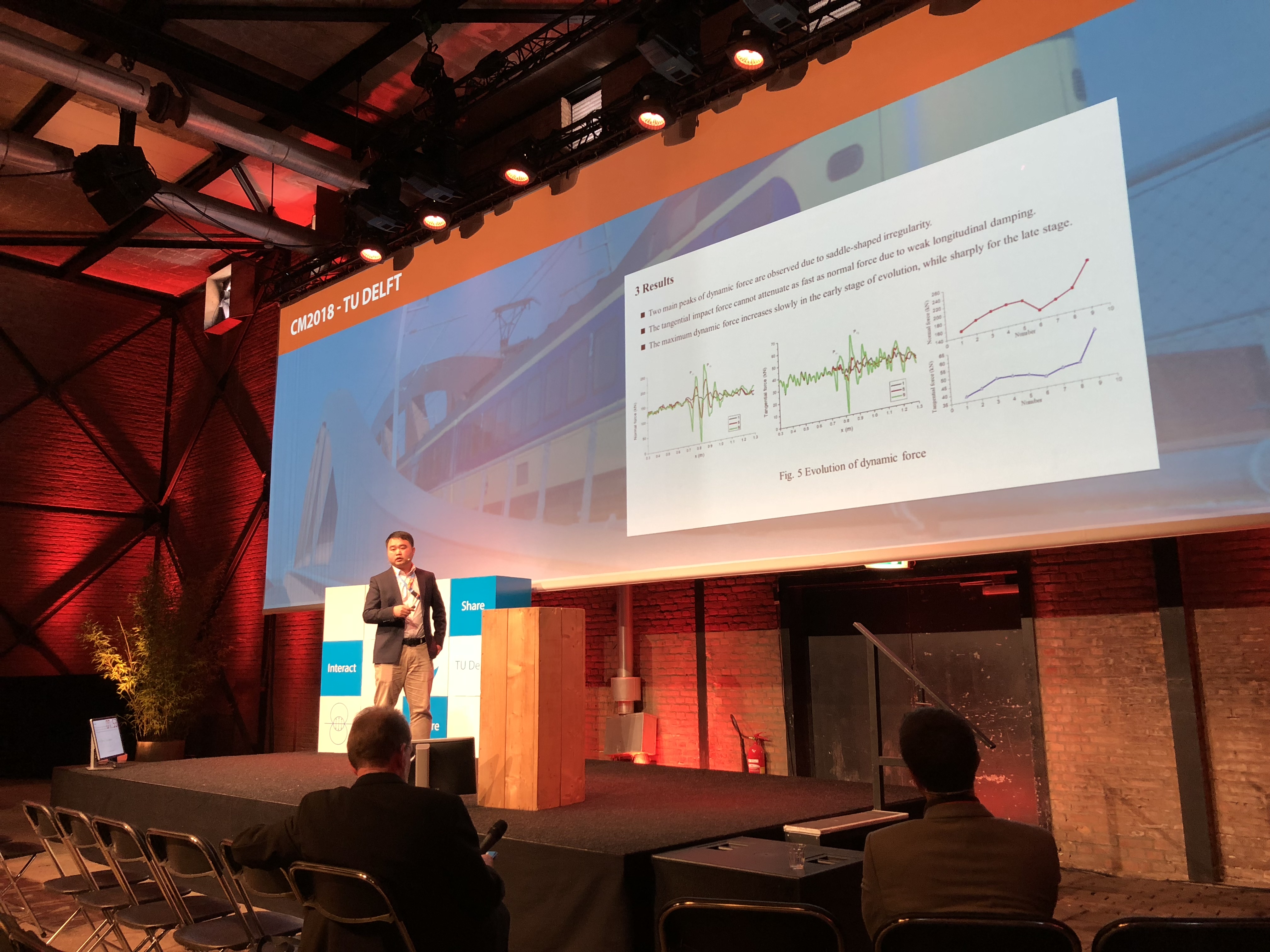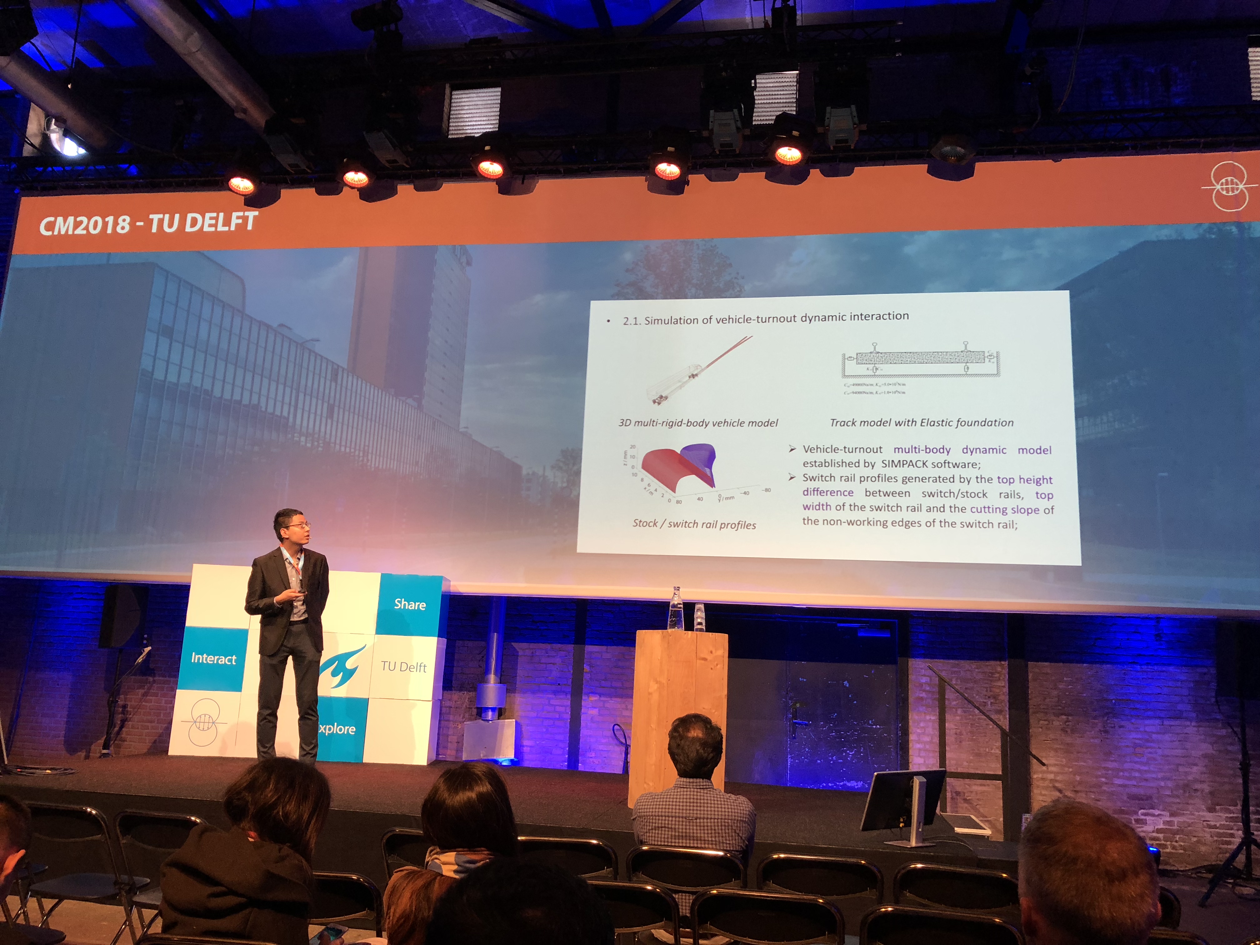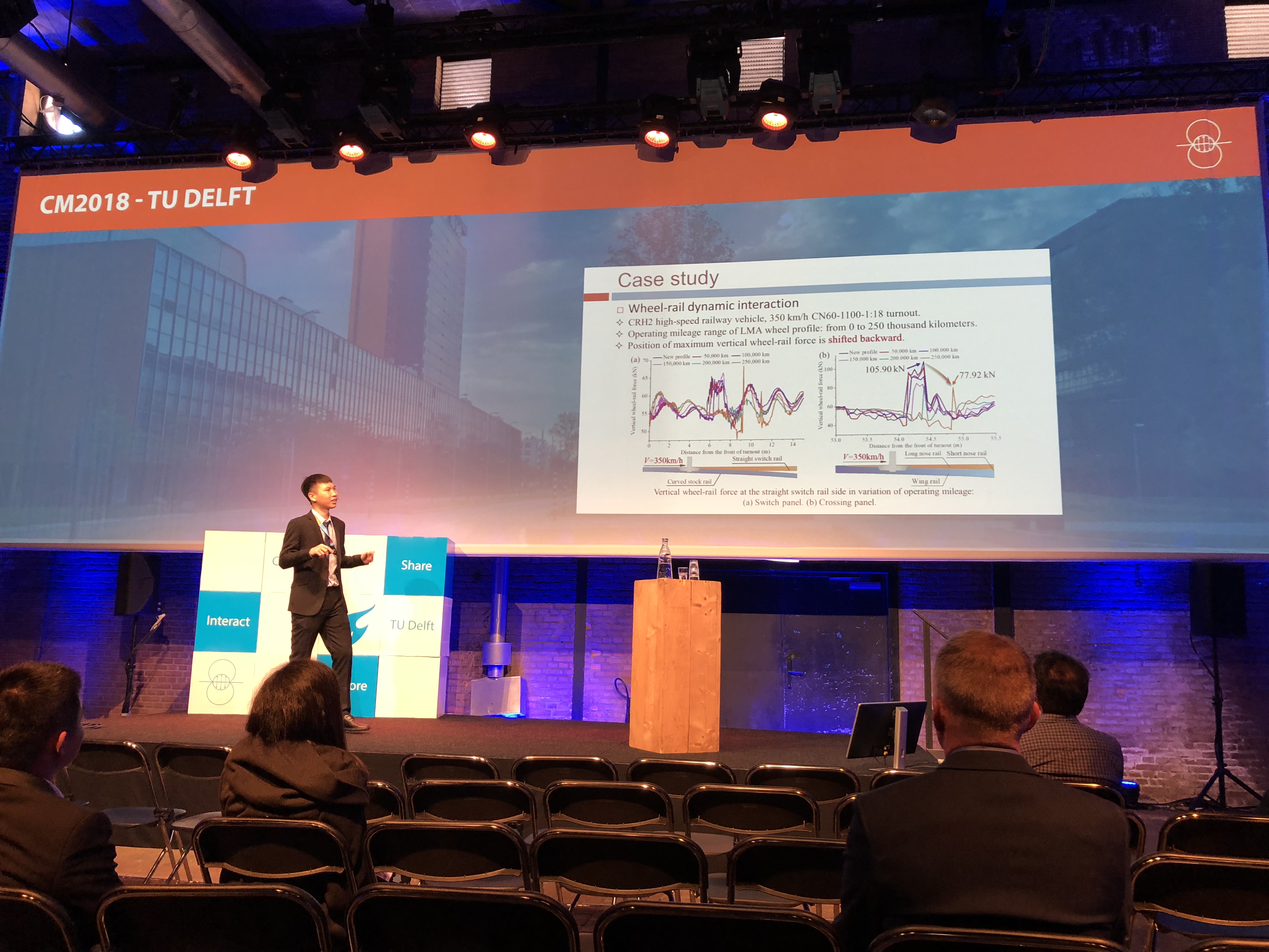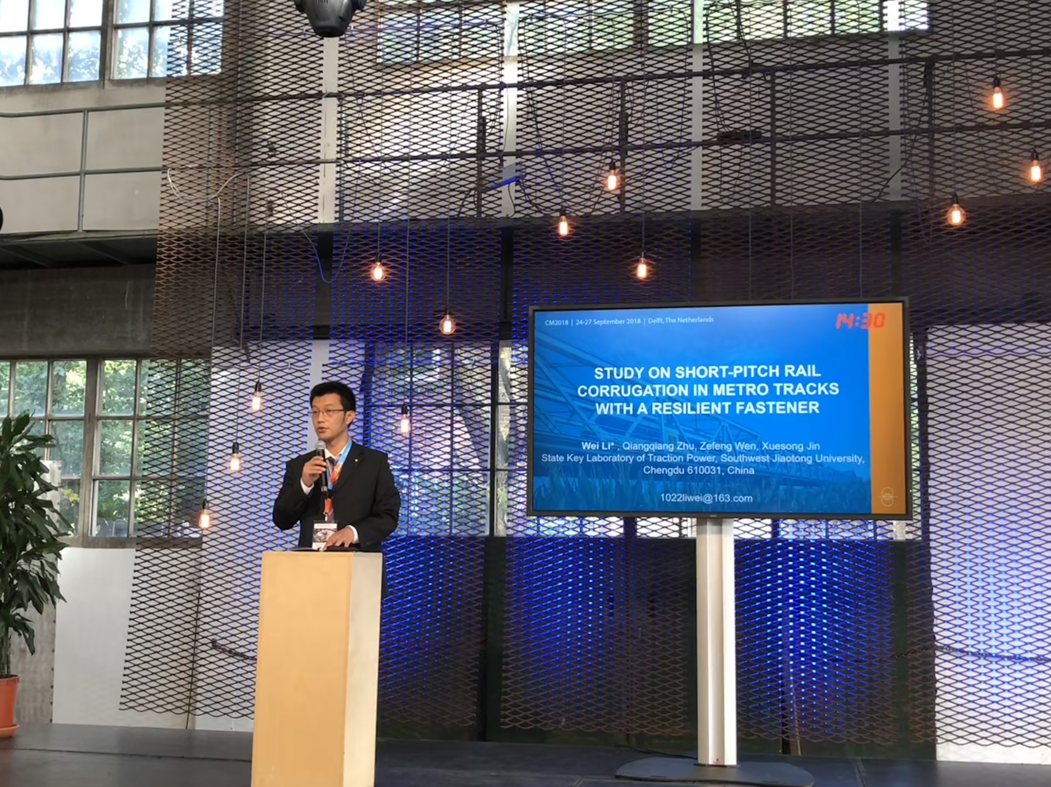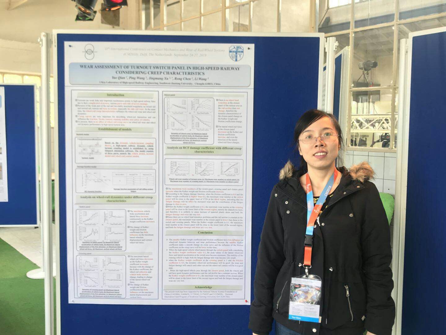 CM系列会议是轮轨系统研究领域中最高级别国际学术会议。本届会议由荷兰代尔夫特理工大学(TUDelft, the Netherlands)承办,于2018年9月24至27日在代尔夫特隆重召开,来自30多个国家的约200多位专家学者参加了本次大会。该会议旨在促进轮轨接触力学、轮轨滚动接触疲劳预测与防治、轮轨磨耗及接触界面摩擦管理等领域的最新研究成果的学术交流,在相关行业具有重大国际影响。会议期间,陈嵘教授受邀担任“Rail Corrugation”分会场主席;道路与铁道工程系与会师生代表作了多场学术报告:徐井芒博士作了题为《Wear Monitoring of Railroad Switch Rail Using Acoustic Emission and Data Mining Techniques》的学术报告;博士生安博洋作了题为《Elastic-Plastic Wheel/Rail Rolling Contact Solution at Rail Weld Using a Dynamic Finite Element Model》的学术报告;博士生陈嘉胤作了题为《Numerical Investigation on Wheel-Turnout Rail Dynamic Interaction and Contact Damage Mechanism with Wheel Profile Evolution》的学术报告;博士生高原作了题为《Comparison of Wheel-Rail Non-Hertzian Contact Models for Numerical Simulation of Rail Damages in Switch Panel of Railway Turnout》的学术报告;博士生陈帅作了题为《Study of Wheel Wear Influenced by Tread Temperature Rising During Tread Barking》;博士生钱瑶和高原分别作了题为《Wear Assessment of Turnout Switch Panel in High-Speed Railway Considering Creep Characteristics》、《Explicit Finite Element Method for Evaluating the Influence of Flange Bearing Frog Crossing on Wheel Degradation》的海报展示。此次报告展示了公司铁道工程研究团队在铁路轮轨关系领域的最新进展,引起了国内外同行的浓厚兴趣,获得一致好评,并受邀参加下届将于澳大利亚莫纳什大学召开的CM 2021会议。