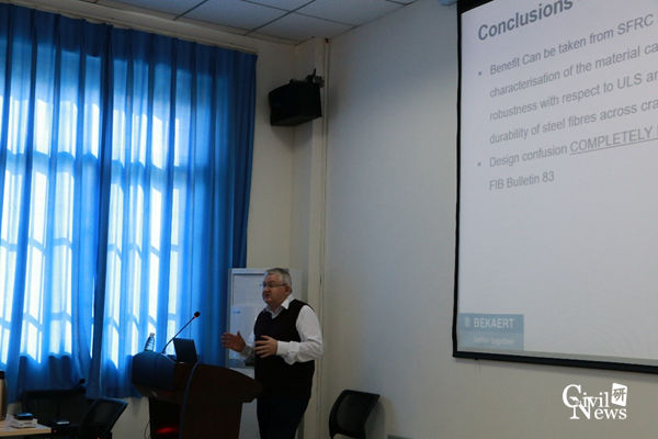 在讲座正式开始前,王志杰教授对主讲人Colin Eddie教授及贝卡尔特公司的全球技术总监Hendrin Thoopt先生做了简短介绍,并对Colin Eddie教授的学术造诣做出高度评价,同时也对其到新葡的京集团35222vip进行学术交流表示热烈欢迎。在简单的自我介绍后,Colin Eddie教授直入主题,先是简要介绍了纤维混凝土,并介绍了英国的隧道设计方法和钢纤维混凝土在世界范围的应用,尤其讲解了从1994年到2018年钢纤维混凝土的设计理论及方法的变化。
