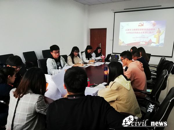 首先,全体党员集体观看学习了中央电视台播放的全国教育大会全部内容,继上一次党员大会学习之后再次领会全国教育大会精神。随后,全体党员共同研读了教育部部长陈宝生《认真学习贯彻全国教育大会精神 开启加快教育现代化建设、建设教育强国新征程》全文和《经由美育抵达精神高地(美育)》一文。会上,老师们认识到作为辅导员,作为干部与教师双肩挑的身份,更应该在立德树人关键环节发挥积极作用。